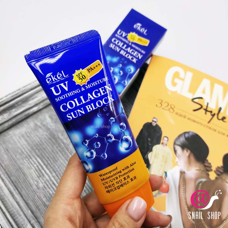-Легкий увлажняющий солнцезащитный крем EKEL с экстрактом алоэ,с фактором UV Sun Block Сream SPF 50/PA+++ с эффективным комплексом фильтров для долговременной и гарантированной защиты от УФ-лучей. Кожа не только защищена от солнца, но и от преждевременного старения. Крем с легкой текстурой, быстро впитывается. Имеет легкий приятный аромат.