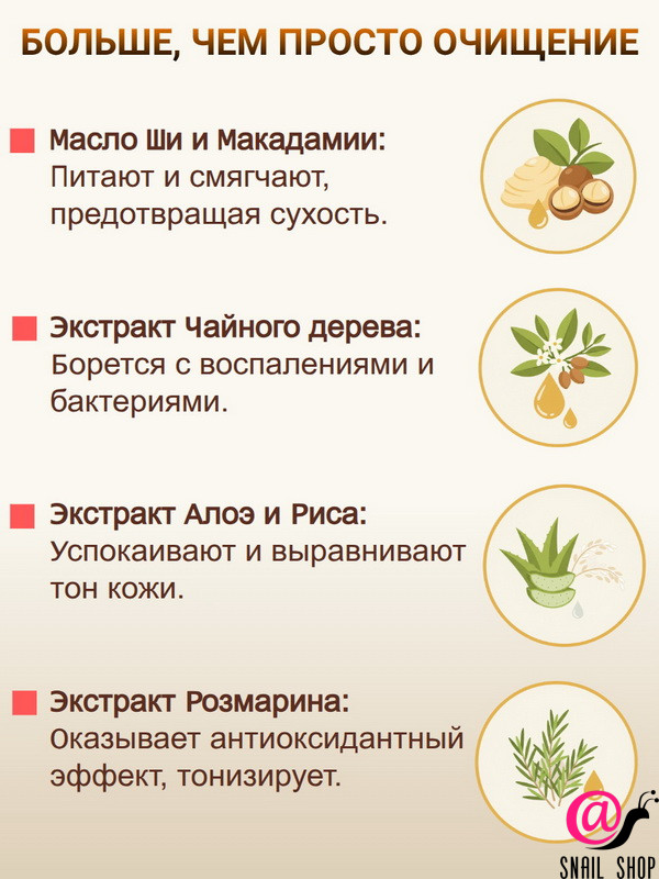 Water/Aqua/Eau, Palmitic Acid, Stearic Acid, Myristic Acid, Glycerin, Lauric Acid, Potassium Hydroxide, Beeswax, Glyceryl Stearate, PEG-100 Stearate, Sodium Laureth Sulfate, Cocamidopropyl Betaine, Sodium Benzoate, Phenoxyethanol, Fragrance (Parfum), Sodium Chloride, Disodium EDTA, Capric Acid, Butyrospermum Parkii (Shea) Butter, Macadamia Ternifolia Seed Oil, Butylene Glycol, 1,2-Hexanediol, Hydrolyzed Collagen (100ppm), Melaleuca Alternifolia (Tea Tree) Extract, Aloe Barbadensis Leaf Extract, Oryza Sativa (Rice) Bran Extract, Rosmarinus Officinalis (Rosemary) Extract, Ethylhexylglycerin, Copper Tripeptide-1 (2ppb), Oligopeptide-32 (2ppb), Oligopeptide-29 (2ppb), Acetyl Hexapeptide-8 (2ppb), Palmitoyl Pentapeptide-4 (2ppb).