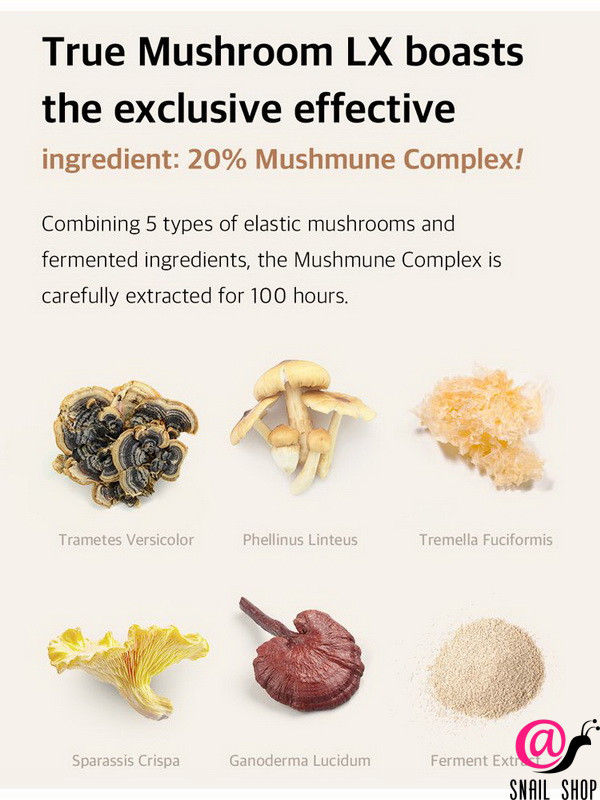 – Экстракт пяти видов грибов (Coriolus Versicolor, Sparassis Crispa, Ganoderma Lucidum, Phellinus Linteus и Tremella Fuciformis) обладает мощным anti-age действием. Заметно улучшает структуру кожи, возвращая ей эластичность и упругость. Это эффективный источник витаминов, макро и микроэлементов, которые препятствуют старению кожи.